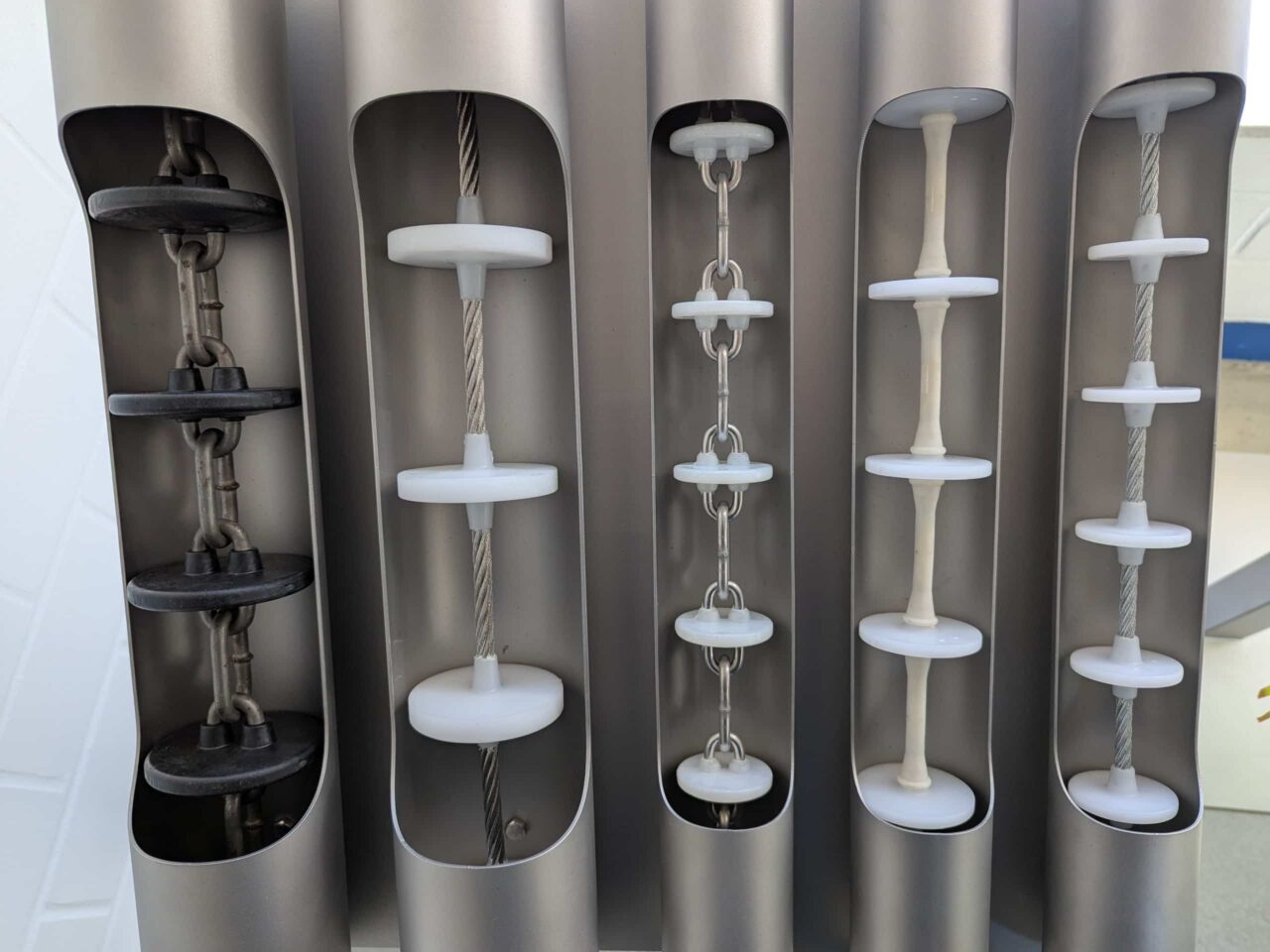 Die Mitnehmerscheiben, die fest mit Seil oder Kette verbunden sind, bilden das zentrale Fördermittel. Sie zeichnen sich durch ihre Widerstandsfähigkeit aus und sind in verschiedenen Typen und Materialien erhältlich. Damit können selbst abrasive oder empfindliche Schüttgüter sicher transportiert werden. - Der Förderweg
